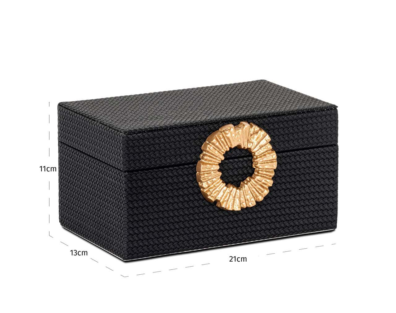 Questa elegante scatola decorativa è pensata per aggiungere un tocco nei tuoi spazi, la texture nera del rivestimento crea un raffinato contrasto con il dettaglio dorato centrale. L'interno rivestito in tessuto chiaro, offre un spazio ordinato per riporre gioielli, chiavi o piccoli accessori.