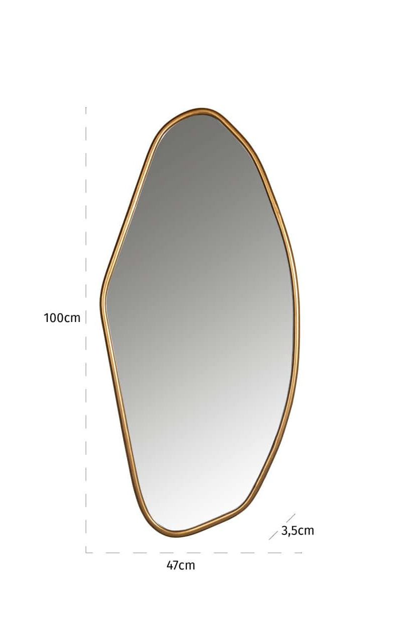 Questo specchio dal design irregolare e contemporaneo unisce semplicità ed eleganza in un' unica forma scultorea. Il profilo sottile in finitura dorata aggiunge luce e profondità agli ambienti. Perfetto per ingressi, salotti, dona un tocco moderno e sofisticato senza appesantire lo spazio.